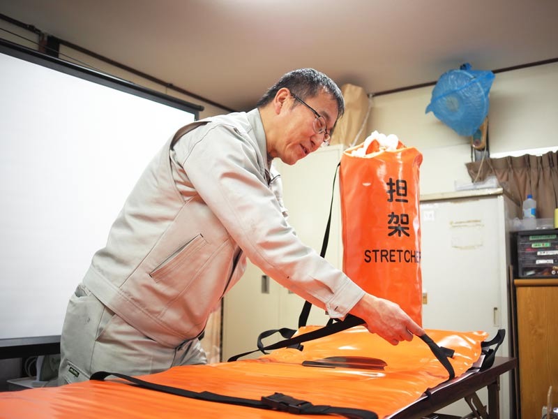 イージーストレッチャーは、力のない方でも傷病者を安全な場所まで運ぶことができる簡易担架です。