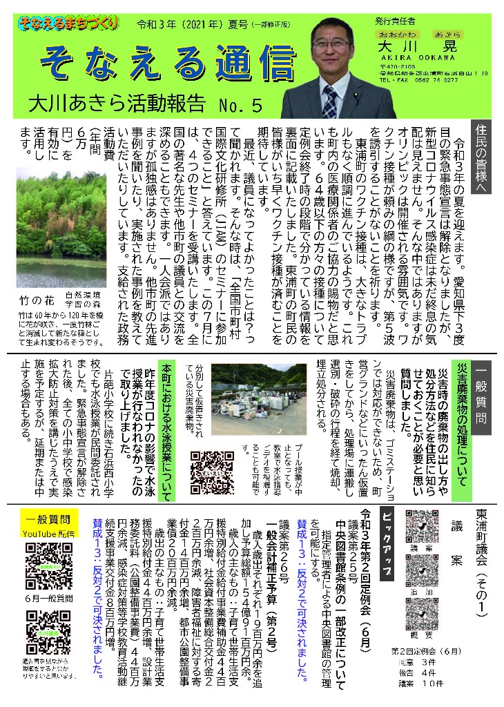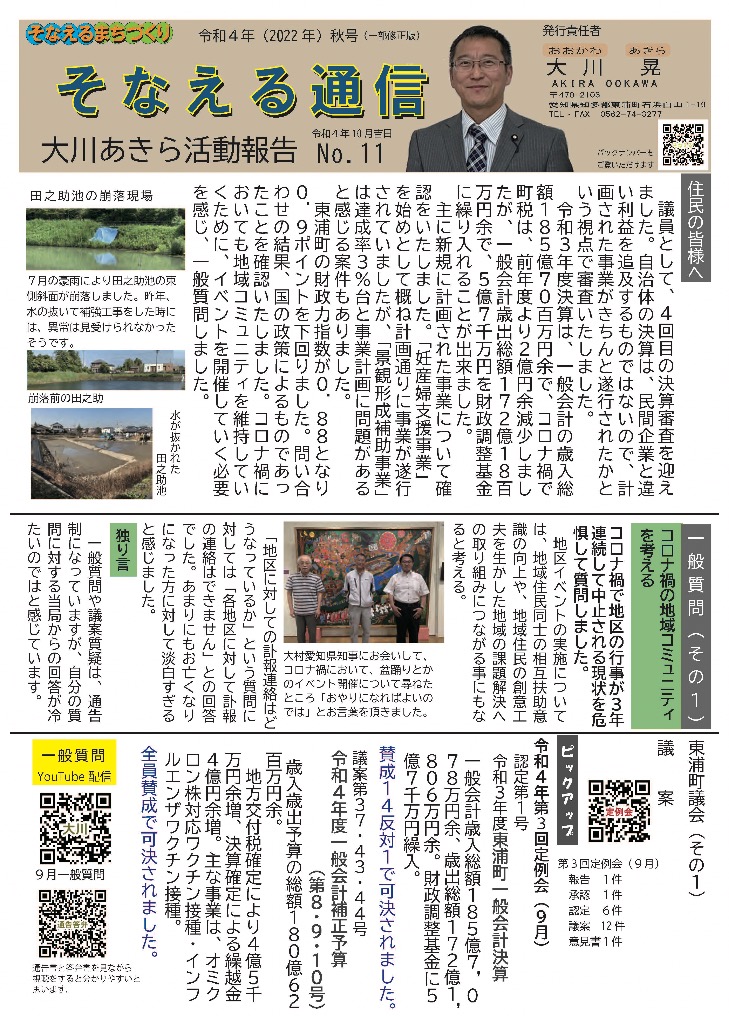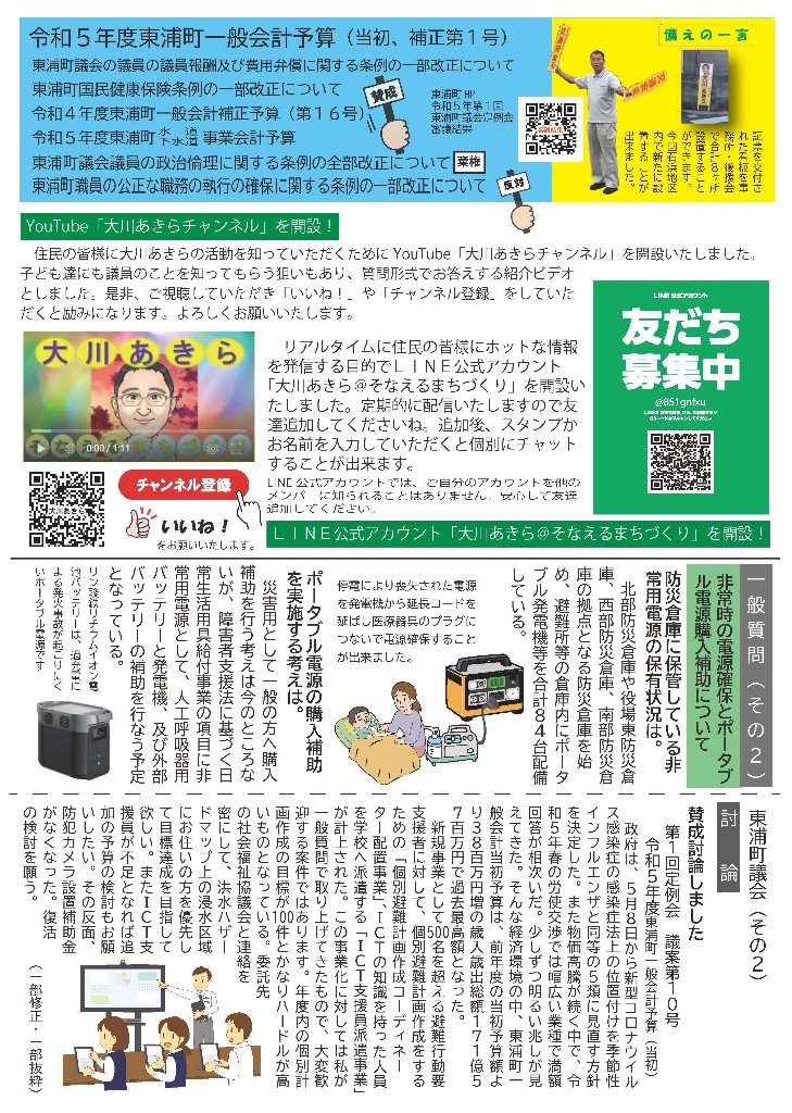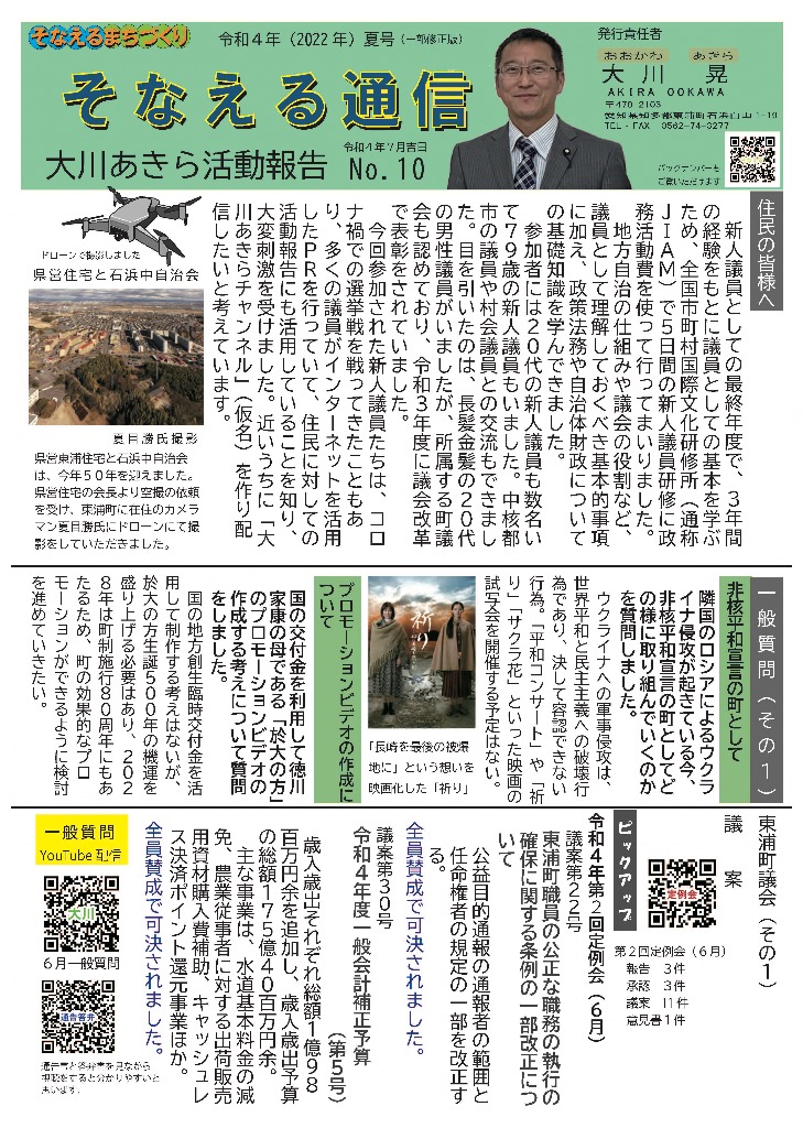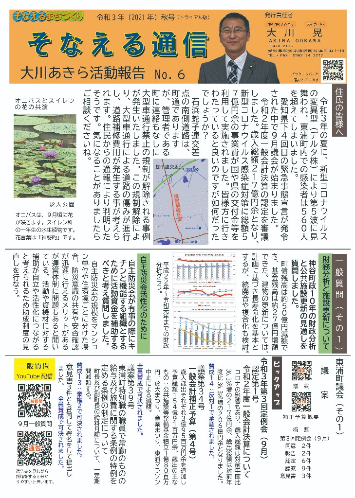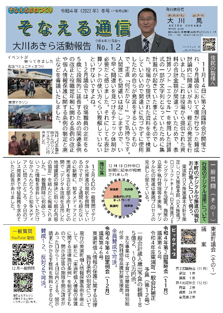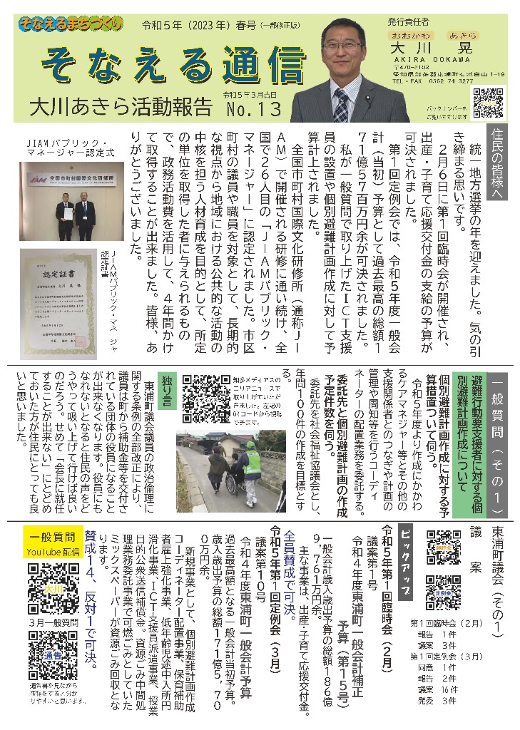 そなえる通信 活動紹介 そなえる通信 住民の皆様へ 東浦町議会議員1期生で無所属議員として活動しています。 政府は、新型コロナウイルス感染症の感染症法上の位置付けを季節性インフルエンザと同等の5類に見直す方針を決定しました。また物価高騰が続く中で、令和5年春の労使交渉では幅広い業種で満額回答が相次ぎました。少しずつ明るい兆しが見えてきた感じがしています。住民の皆様にリアルタイムにホットな情報をお届けできるよう、「大川あきら@そなえるまちづくり」公式LINEアカウントを開設いたしました。また、YouTube「大川あきらチャンネル」も開設いたしました。大川あきらの活動を順次アップしていこうと思います。「チャンネル登録」や「いいね」をお願いいたします。 活動報告として「そなえる通信」を作成しています。ご覧くださりご意見を賜りますと今後の励みとなりますのでよろしくお願いいたします。 そなえる通信9号 2022年春号 表 そなえる通信9号 2022年春号 裏 そなえる通信8号 2022年冬号 表 そなえる通信8号 2022年冬号 裏 そなえる通信7号 2021年秋臨時号 表 そなえる通信7号 2021年秋臨時号 裏 そなえる通信6号 2021年秋号 表 そなえる通信6号 2021年秋号 裏 そなえる通信5号 2021年夏号 表 そなえる通信5号 2021年夏号 裏 そなえる通信4号 2021年臨時号 表 そなえる通信4号 2021年臨時号 裏 そなえる通信3号 2021年春号 表 そなえる通信3号 2021年春号 裏 そなえる通信10号 2022年夏号 表 そなえる通信10号 2022年夏号 裏 そなえる通信11号 2022年秋号 表 そなえる通信11号 2022年秋号 裏 そなえる通信12号 2022年冬号 表 そなえる通信12号 2022年冬号 裏 そなえる通信13号 2023年春号 表 そなえる通信13号 2023年春号 裏 活動紹介 キッズぼうさい活動 グラウンド慣らし コミュニティウィーキング大会 学生向け普通救命講習 県営住宅防災訓練 子ども食堂交通整理 子供太鼓の指導 自治会委員会 自主防災会訓練 第1回防災委員会 朝の交通立哨 藤波辰爾さんと一緒 日赤指導員活動 夜間パトロール 傳兵衛クラブ