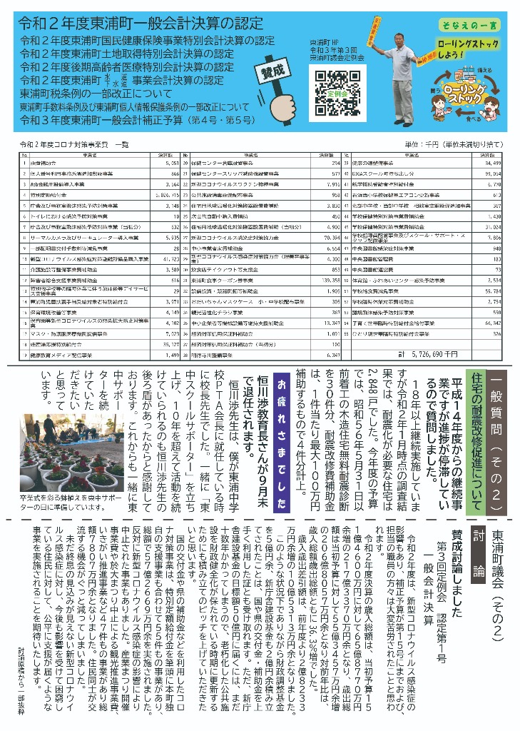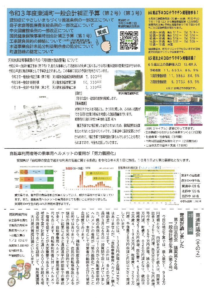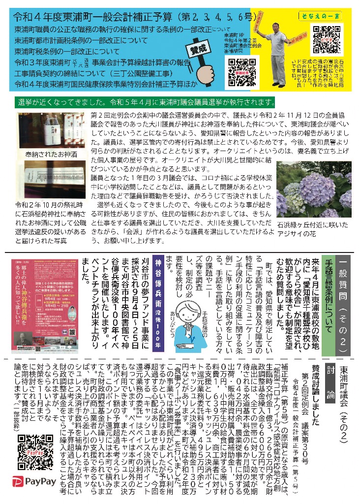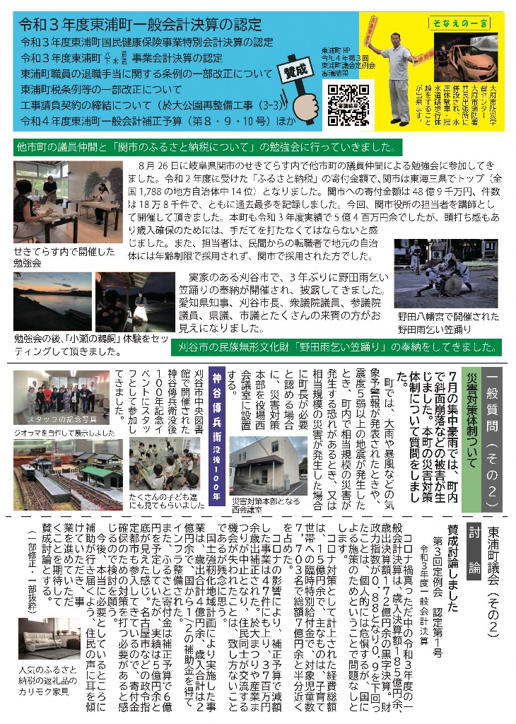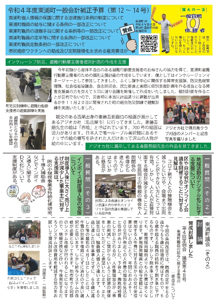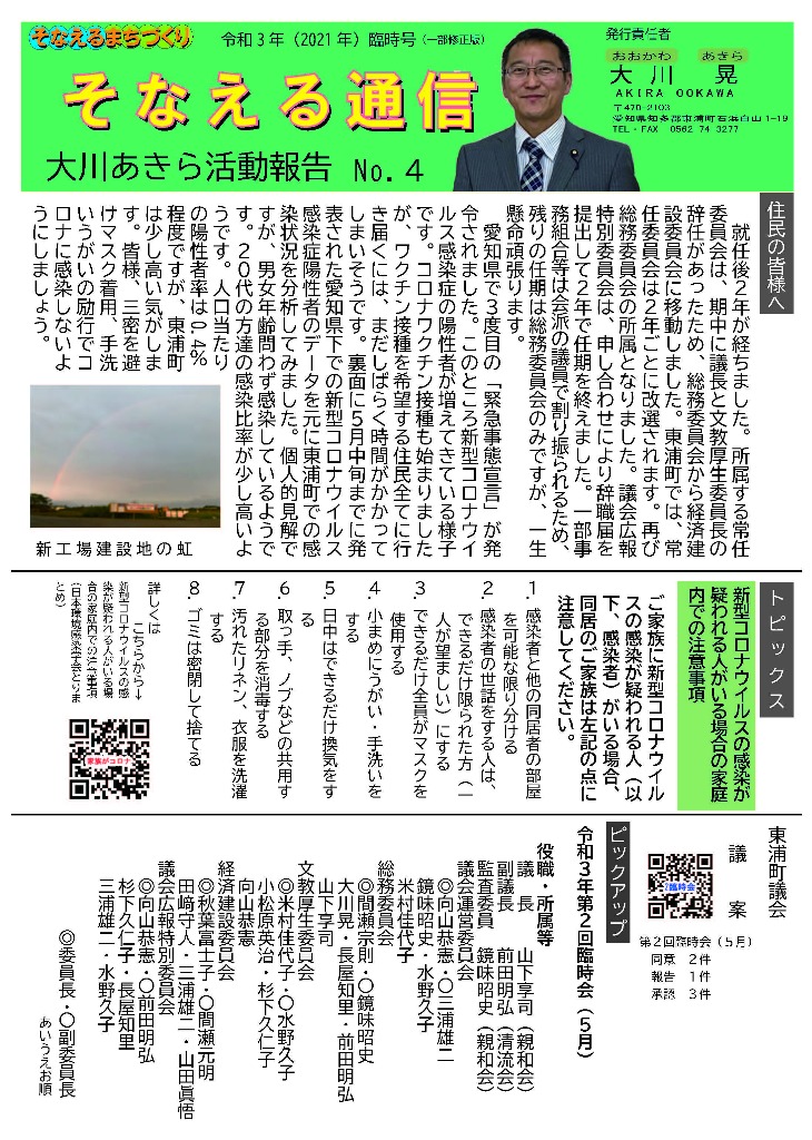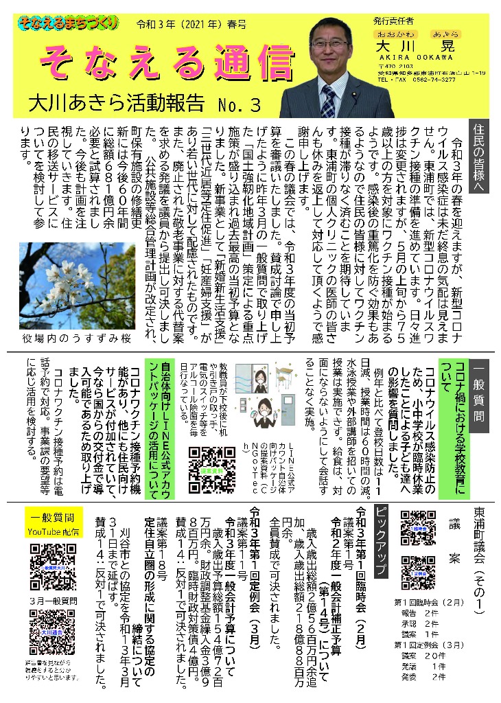 そなえる通信 活動紹介 そなえる通信 住民の皆様へ 東浦町議会議員1期生で無所属議員として活動しています。 政府は、新型コロナウイルス感染症の感染症法上の位置付けを季節性インフルエンザと同等の5類に見直す方針を決定しました。また物価高騰が続く中で、令和5年春の労使交渉では幅広い業種で満額回答が相次ぎました。少しずつ明るい兆しが見えてきた感じがしています。住民の皆様にリアルタイムにホットな情報をお届けできるよう、「大川あきら@そなえるまちづくり」公式LINEアカウントを開設いたしました。また、YouTube「大川あきらチャンネル」も開設いたしました。大川あきらの活動を順次アップしていこうと思います。「チャンネル登録」や「いいね」をお願いいたします。 活動報告として「そなえる通信」を作成しています。ご覧くださりご意見を賜りますと今後の励みとなりますのでよろしくお願いいたします。 そなえる通信9号 2022年春号 表 そなえる通信9号 2022年春号 裏 そなえる通信8号 2022年冬号 表 そなえる通信8号 2022年冬号 裏 そなえる通信7号 2021年秋臨時号 表 そなえる通信7号 2021年秋臨時号 裏 そなえる通信6号 2021年秋号 表 そなえる通信6号 2021年秋号 裏 そなえる通信5号 2021年夏号 表 そなえる通信5号 2021年夏号 裏 そなえる通信4号 2021年臨時号 表 そなえる通信4号 2021年臨時号 裏 そなえる通信3号 2021年春号 表 そなえる通信3号 2021年春号 裏 そなえる通信10号 2022年夏号 表 そなえる通信10号 2022年夏号 裏 そなえる通信11号 2022年秋号 表 そなえる通信11号 2022年秋号 裏 そなえる通信12号 2022年冬号 表 そなえる通信12号 2022年冬号 裏 そなえる通信13号 2023年春号 表 そなえる通信13号 2023年春号 裏 活動紹介 キッズぼうさい活動 グラウンド慣らし コミュニティウィーキング大会 学生向け普通救命講習 県営住宅防災訓練 子ども食堂交通整理 子供太鼓の指導 自治会委員会 自主防災会訓練 第1回防災委員会 朝の交通立哨 藤波辰爾さんと一緒 日赤指導員活動 夜間パトロール 傳兵衛クラブ